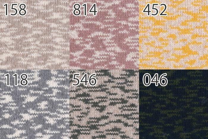 メリヤス編みで自然に模様が現れる楽しい糸です。軽い仕上がりなので、分量の大きなウエアにもぴったりです。