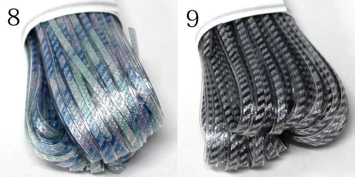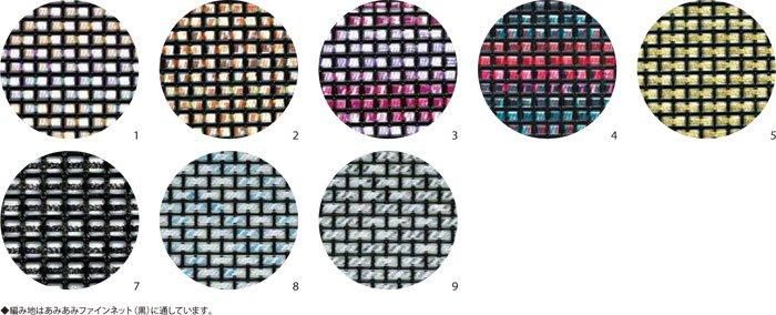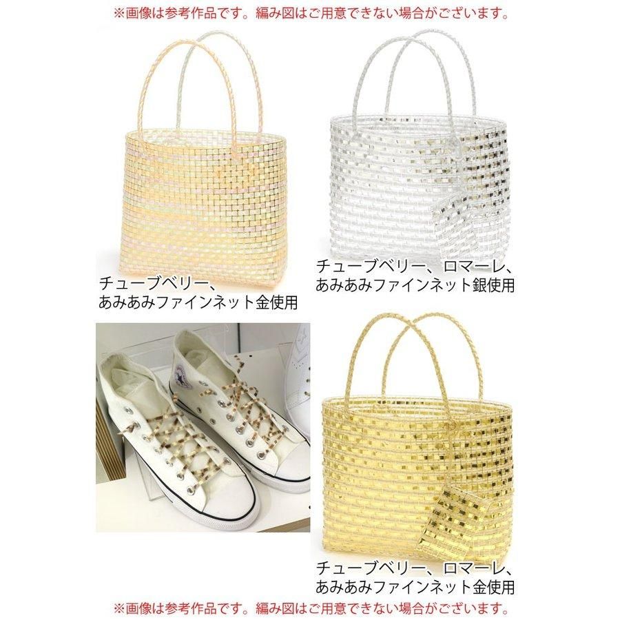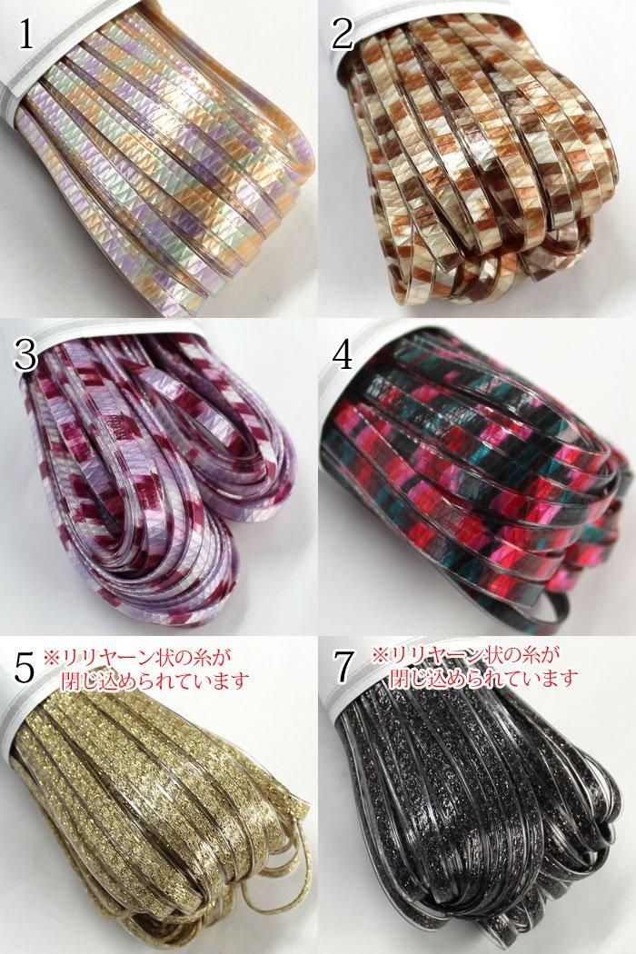 5mm幅の、テープ状の糸です。ロマーレ同様、あみあみファインネットに通すバッグはもちろん、柔らかいので棒針での素編み作品にもお使いいただけます。#5色・#7色 は、扁平リリヤーン状のラメ糸がチューブに閉じ込められています。