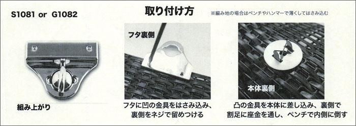 バッグのフタの縁に挟み、ネジで取り付けるタイプの金具です。