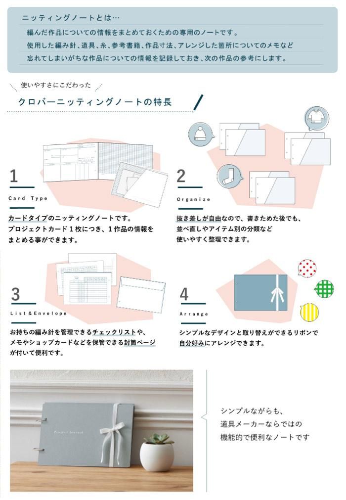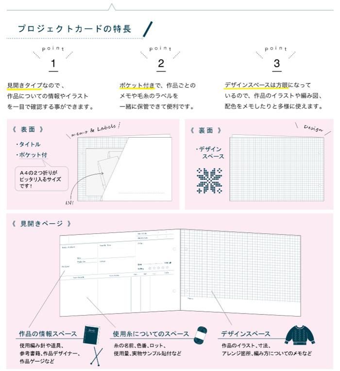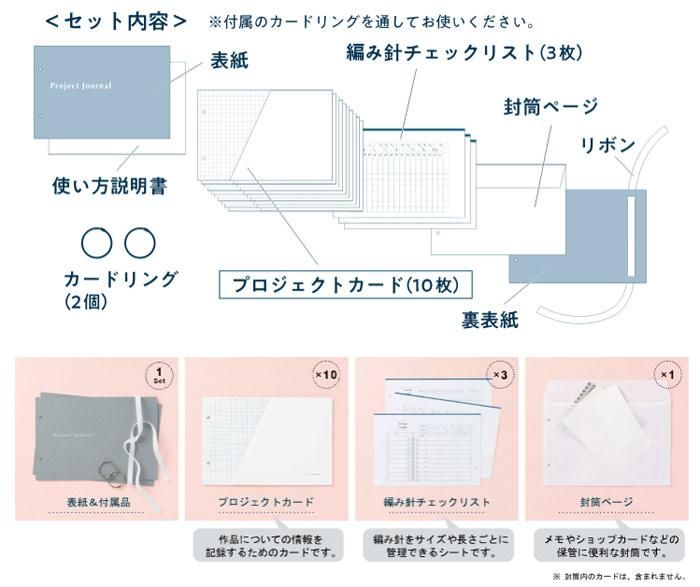 ●内容:表紙、説明書、プロジェクトカード(10枚)、あみ針チェックリスト(3枚)、封筒ページ(1枚)、裏表紙、リボン、カードリング(2個)