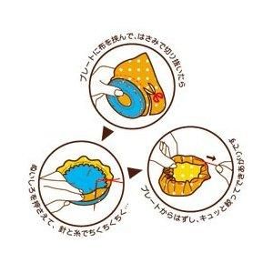 作り方は、プレートに布を挟んで、はさみで切り抜いたら→ぬいしろを押さえて、針と糸でちくちくちく…→プレートからはずし、キュッと絞ってできあがりです。