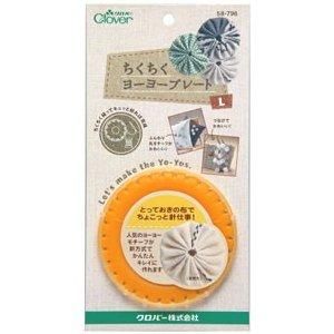 ヨーヨーの出来上がりのサイズは直径約45mm。作り方は、プレートに布を挟んで、はさみで切り抜いたら→ぬいしろを押さえて、針と糸でちくちくちく…→プレートからはずし、キュッと絞ってできあがりです。
