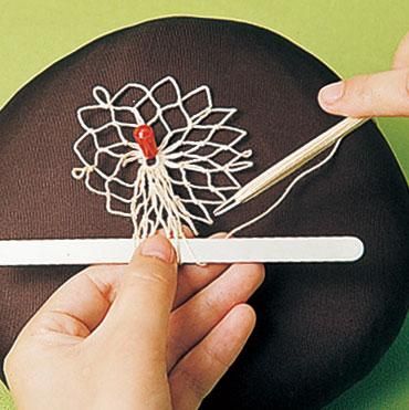 フィレーレース。編み糸を巻いたあみ針と目板を使って糸の結び目を作り、ネットを編んでいきます。