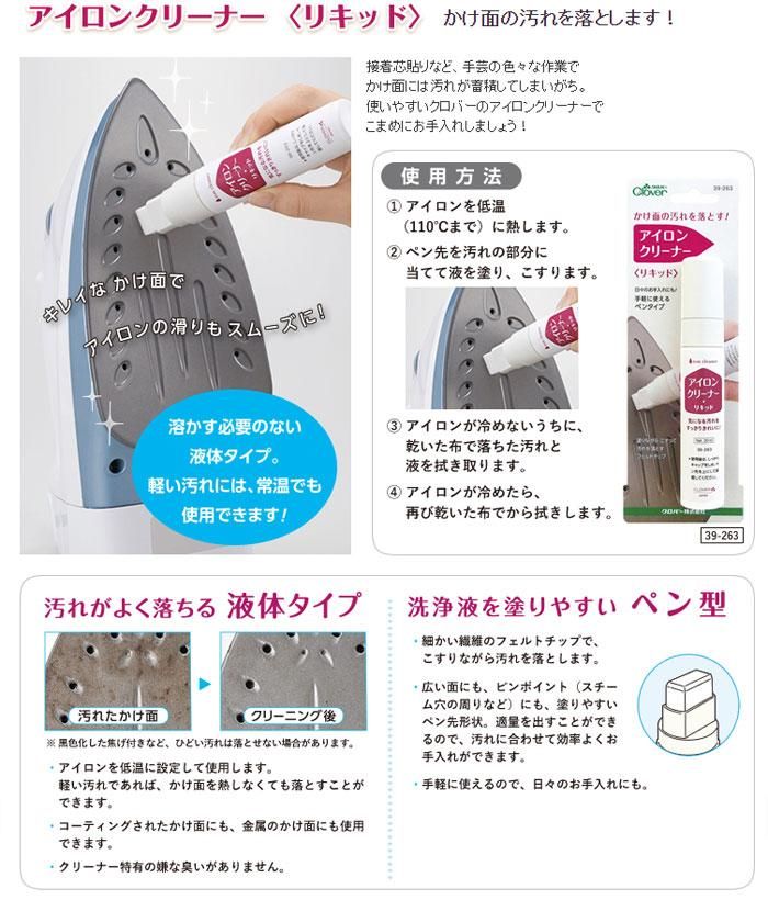 接着芯貼りなど、手芸のいろいろな作業でかけ面には汚れが蓄積してしまいがち。使いやすいクロバーのアイロンクリーナーでこまめにお手入れしましょう! キレイなかけ面でアイロンの滑りもスムーズに♪溶かす必要のない液体タイプ。軽い汚れには、常温でも使用できます。
