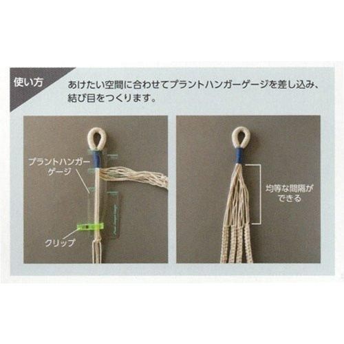 マクラメの結び目を自由に組み合わせることで、様々なデザインの作品が作れます。プラントハンガーづくりには、“結び目の間隔を均等にあける”という作業が必要です。その作業でプラントハンガーゲージを使うと、間隔がきれいに揃った作品が仕上がります。