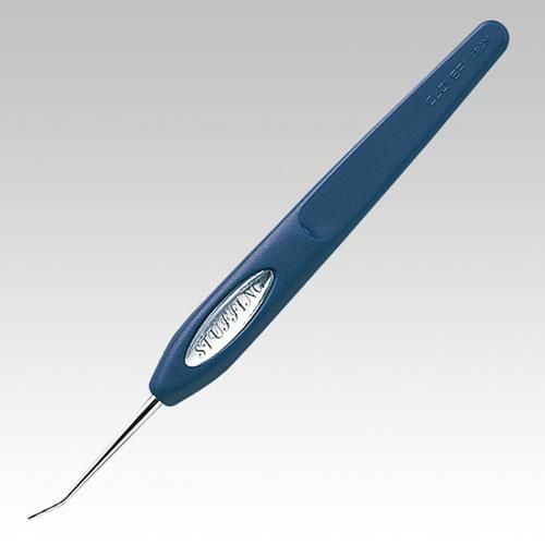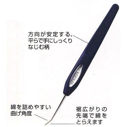 裾広がりの先端で綿をとらえます。 細かい部分のスタッフィング(綿づめ)に最適です。方向が安定する、平らで手にしっくりなじむ柄と綿を詰めやすい曲げ角度。