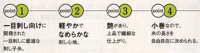 一目刺し向けに開発された、一目刺しに最適な刺し子糸です。軽やかでなめらかな刺し心地で、艶があり上品で繊細に仕上がります。