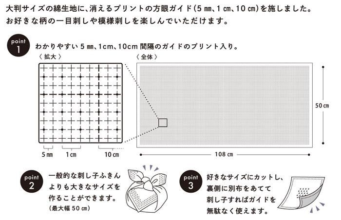 大判サイズの綿生地に、水洗いで消えるプリントのガイド(5mm、1cm、10cm)が施されています。お好きな柄の一目刺しや模様刺しを楽しんでいただけます。