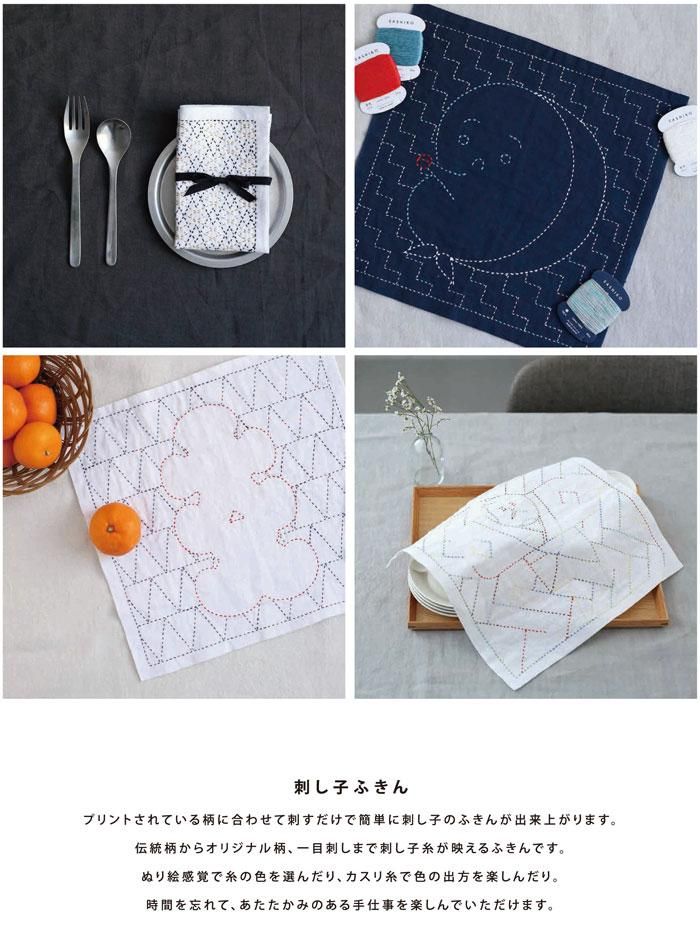 プリントされている柄に合わせて刺すだけで簡単に刺し子のふきんが出来上がります。