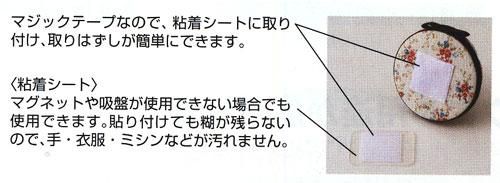 ミシンや作業台など好きな場所に貼り付けて使える粘着タイプ。 粘着シート式。粘着力が弱くなっても洗って乾かせば回復します。