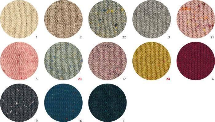 アランツィードは、軽さとソフトな風合い、大きめのネップが特徴の並太ツィードタイプ。アランやフェアアイルなどの伝統柄ニットに最適です。ベストからジャケット、ウェア小物まで幅広くご使用いただけます。