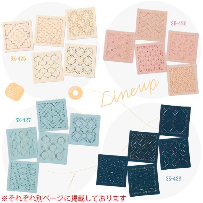 大人気な伝統柄を5種類刺せて満足感たっぷり!刺し子糸〈細〉ならではの繊細な模様も刺していただけます。 刺し子の糸を多色使いしてるためカラフルな色合いを楽しめ、光沢があり糸滑りがいい〈細〉の刺しやすさも味わっていただけます。1つのキットで5枚作れます。