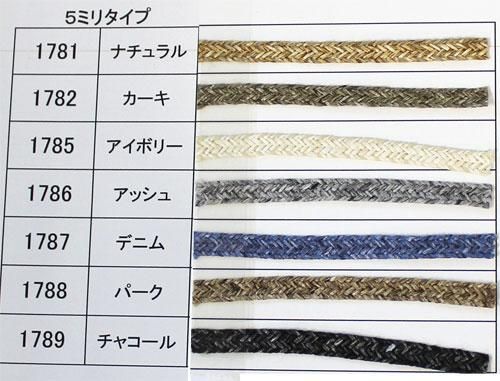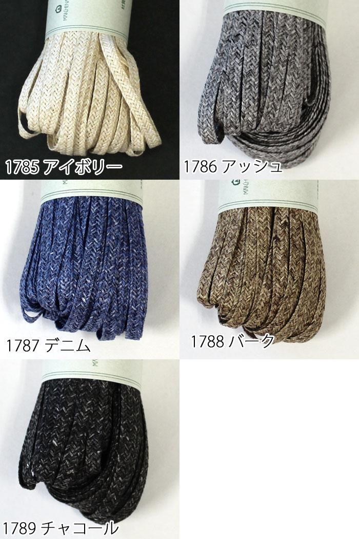 米松、米杉、イエローシダーやヘムロック、トウヒ、パインなどの針葉樹をブレンドした、ナチュラルな風合いのテープです。国内の高度な特殊着色技術で色付けされており、ブレード状に織り上げられています。木材を使用することで地球環境にやさしいサスティナブルな素材で、軽くてハリもあり、瞬間接着剤で始末できるのが特長です。棒針やかぎ針で編んだり、マクラメにも向く万能素材です。