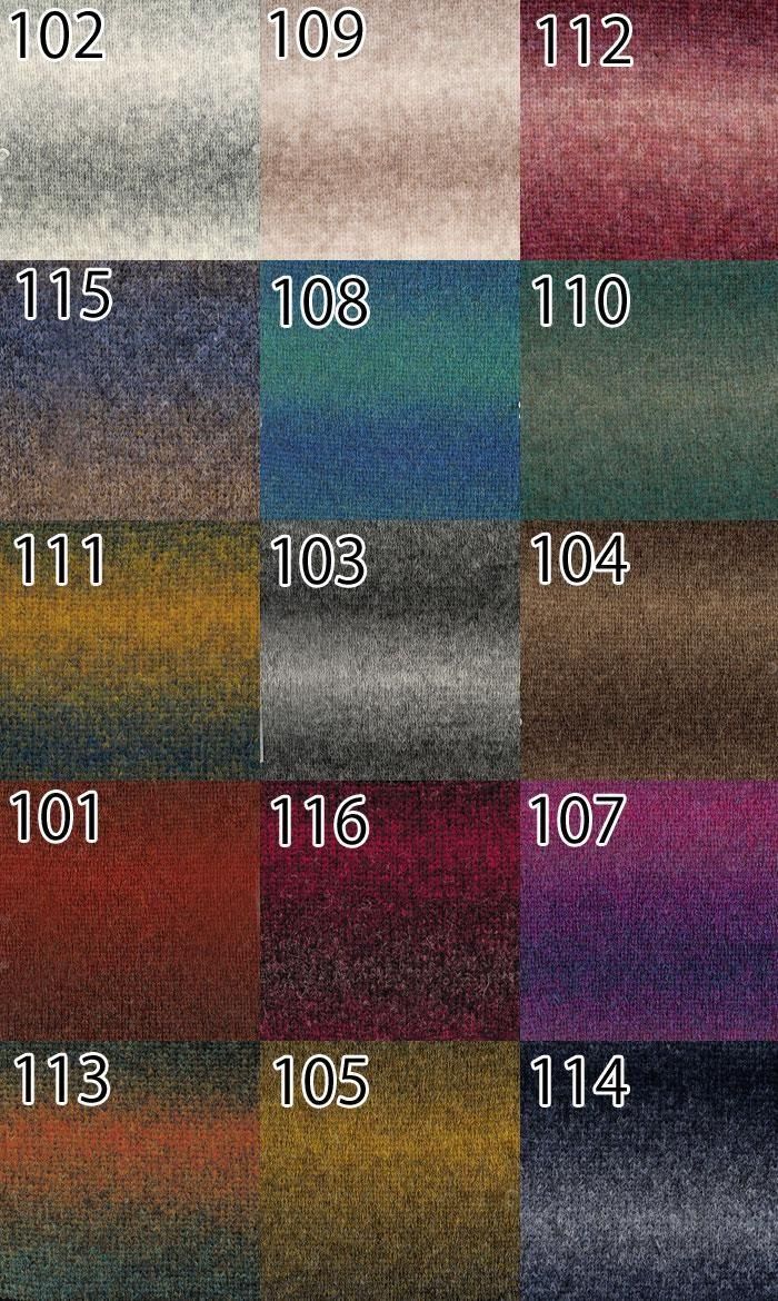 アルパカレジェーログラデーションは、アルパカ繊維のスライバーを2色用意し、その混率を徐々に変化させながら機械に送り込むことによってグラデーション効果を醸し出しています。リリヤーンに編む前の段階で撚糸工程が入っていないので、非常にソフトな風合いと軽い構造が実現されています。自然界に見られるグラデーションカラーによるカラーレンジになっています。