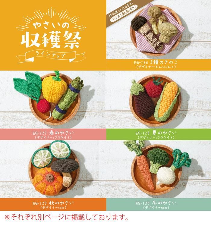 【作家コメント】太陽をたっぷり受けた夏のやさいたち。落ち着いたトーンでリアルなフォルムを楽しめるようデザインしました。時間をかけてじっくり編むことで、心の栄養になるかもしれません。豊かな時間が生まれますように。