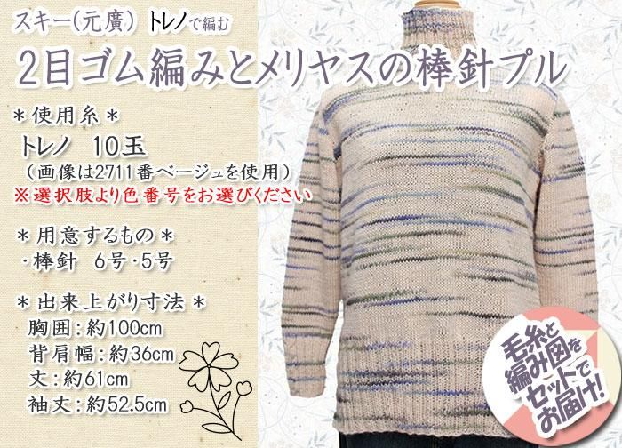 スキー毛糸(元廣) 2目ゴム編みとメリヤスの棒針プル 着分セット(トレノ10玉・編図)【着分122番】
