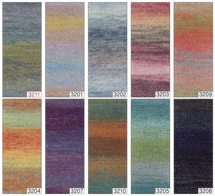 多色や段染の細い糸を多数組み合わせることで変化に富んだロングピッチの色変化が生まれ、その中にマルチカラーラメの繊細な光が個性的な表情を作っています。