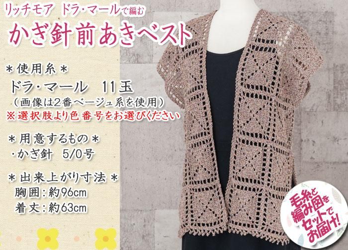 リッチモア かぎ針前あきベスト 着分セット(ドラマール11玉・編図)【着分76番】
