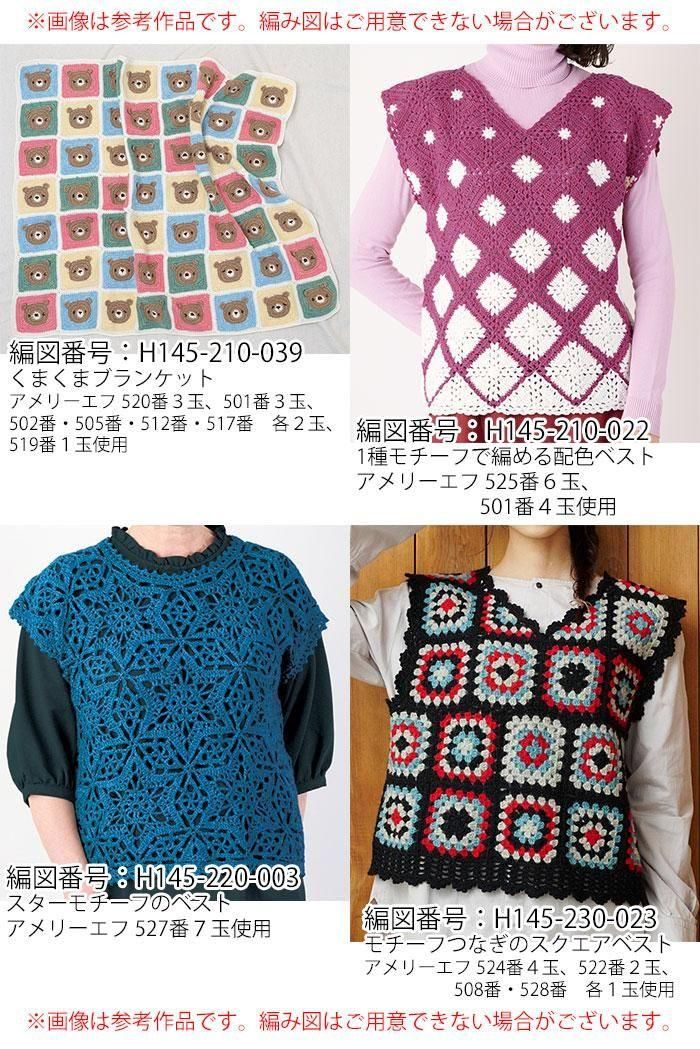 ●糸使用量(平均):プルオーバー 8〜9玉 / カーディガン 9〜10玉 / ベスト 5〜6玉