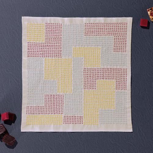 刺し子作家AYUFISH int.さんデザインの刺し子花ふきんキットです。 模様刺し、一目刺し、くぐり刺しの技法で、伝統柄とは違った、モダンテキスタイルな刺し子模様をお楽しみいただけます。図案プリント済み。
