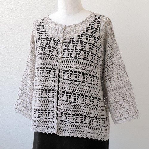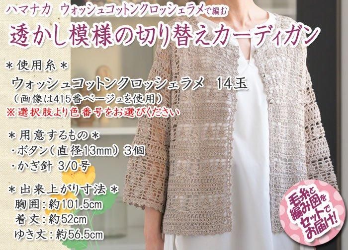 ハマナカ 透かし模様の切り替えカーディガン 着分セット(ウォッシュコットンクロッシェラメ14玉・編図)【着分08番】編み物キット