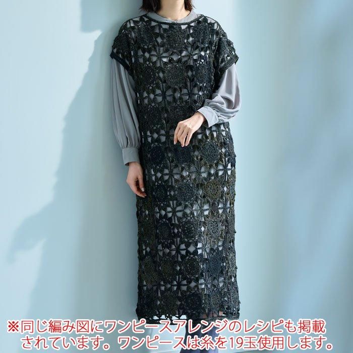 ※同じ編み図にワンピースアレンジ(身幅約63cm、ゆき丈約33.5cm、着丈(平置き時)約103cm、(着用時)約125cm(※着用すると重みで編地が伸びます))のレシピが掲載されています。ワンピースは糸を19玉使用します。