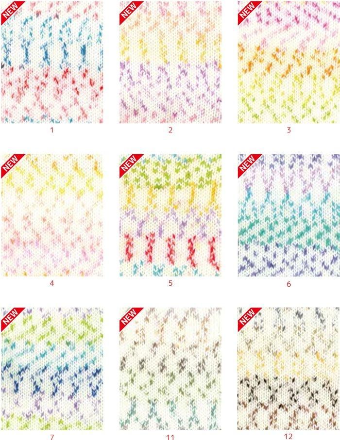 スーパーソフトDKドットは、多色のドット模様を定期的に表現された合太タイプのストレートヤーン。パステルカラー中心の色展開でキッズやベビーものでも良い糸です。