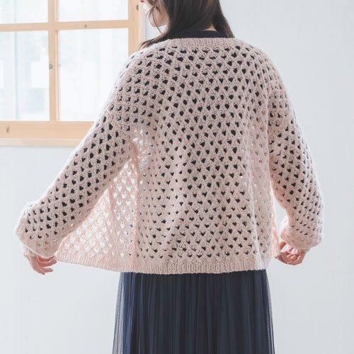 透かし編みの模様が起毛でハート型に見える編地がキュート。ふわっと羽織るデザインで、少し後ろに抜くとカッコよくきまります。