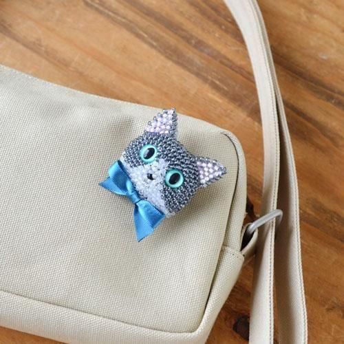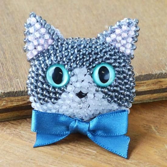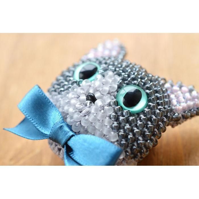 レース糸に通したビーズをかぎ針で編み込みながら作るかわいい猫のブローチキットです。