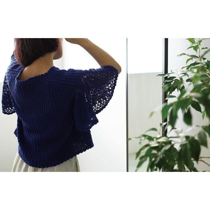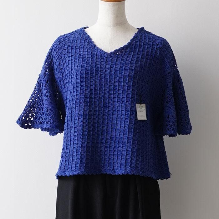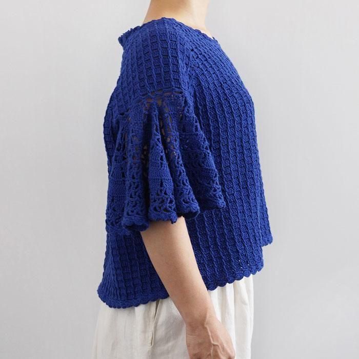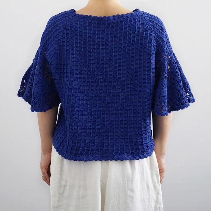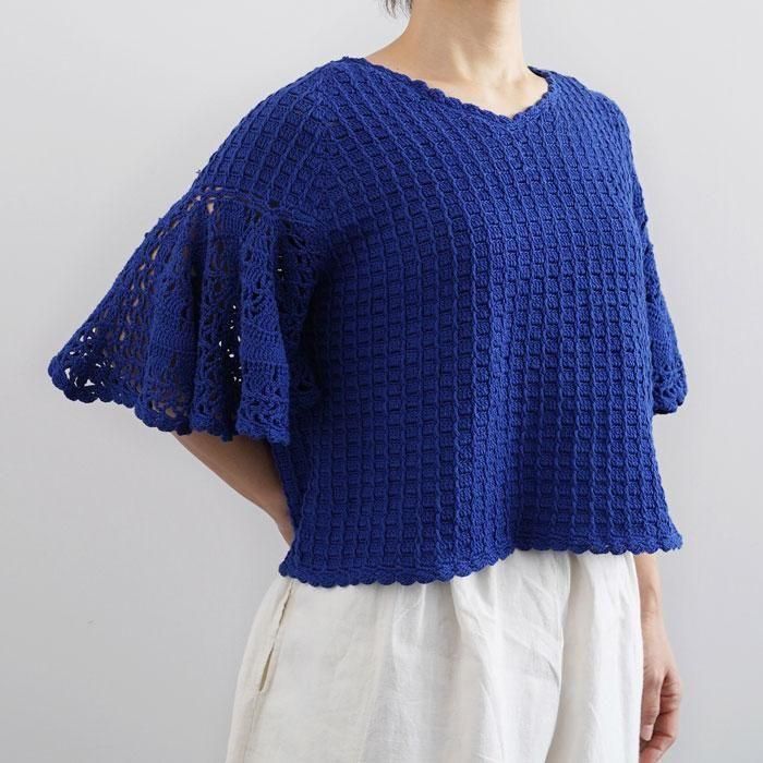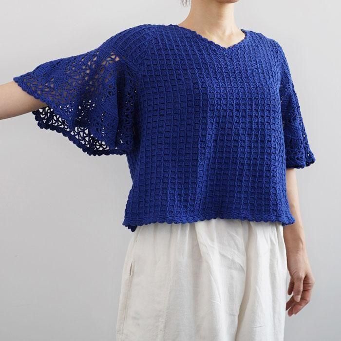 レース編みのようなフレアの袖がふんわり揺れるサマーウェア。さらっと心地よく暑い夏を涼しげに演出してくれます。