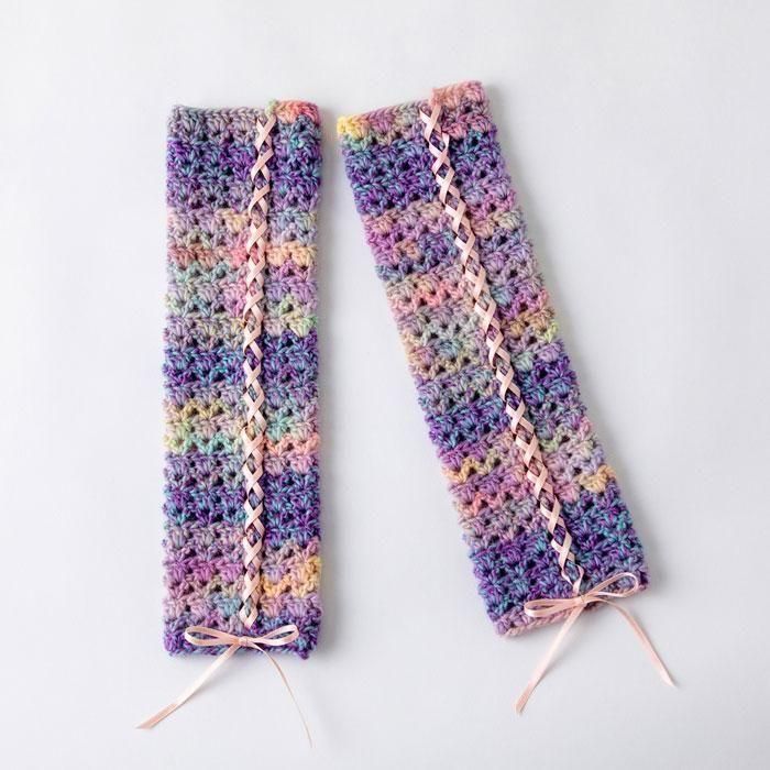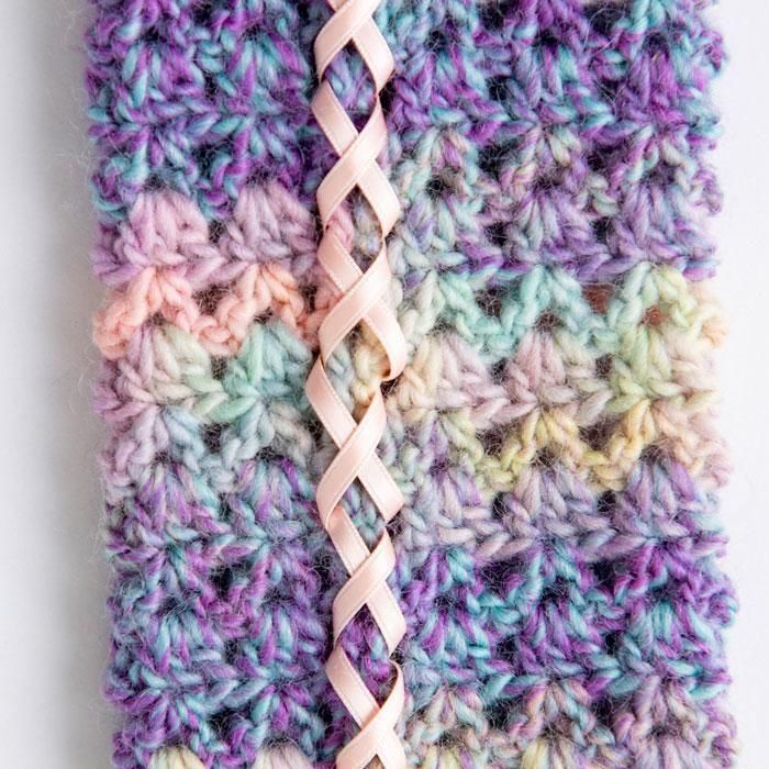 まっすぐ平らに編み、後からサテンリボンで編み上げます。モバ編みにもおすすめです。