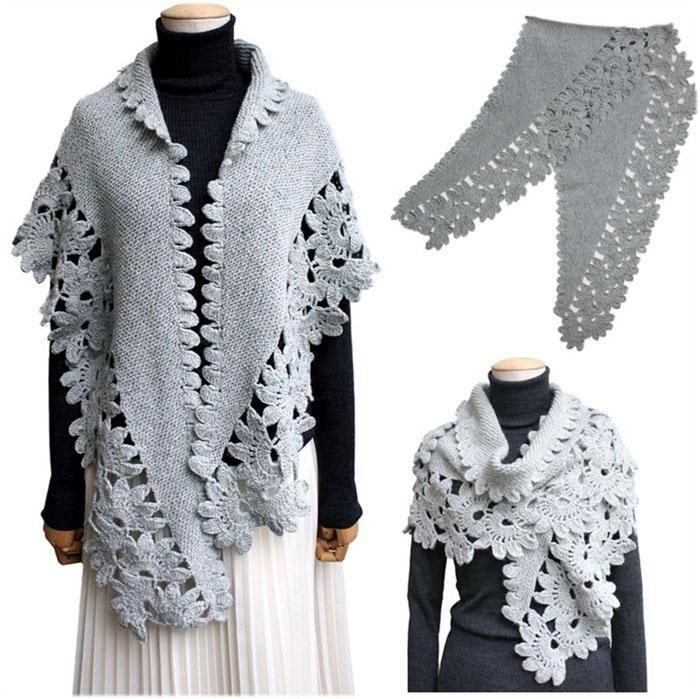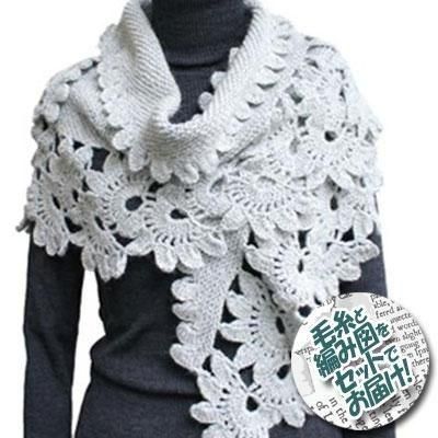 本体はガーター編みでシンプルに編み、縁回りにかぎ針で花模様を編みつけます。 冬の装いのアクセントにぴったりな1枚です。