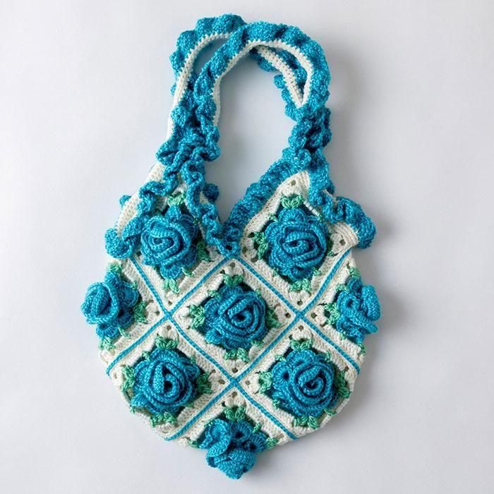 バラから編みはじめ、モチーフに仕立てつないでいきます。フリルたっぷり、ロマンチックなバッグです。