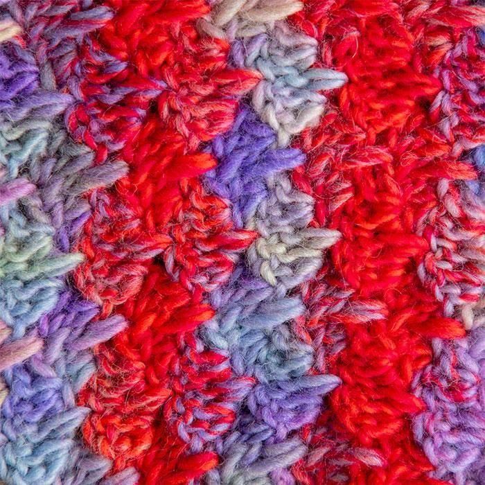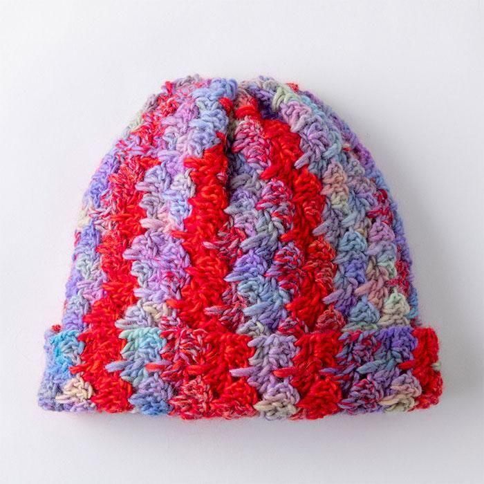 横向きに編む、サイズ調整がしやすいデザイン。模様の折り返しが覚えやすいので、モバ編みにもおすすめです。